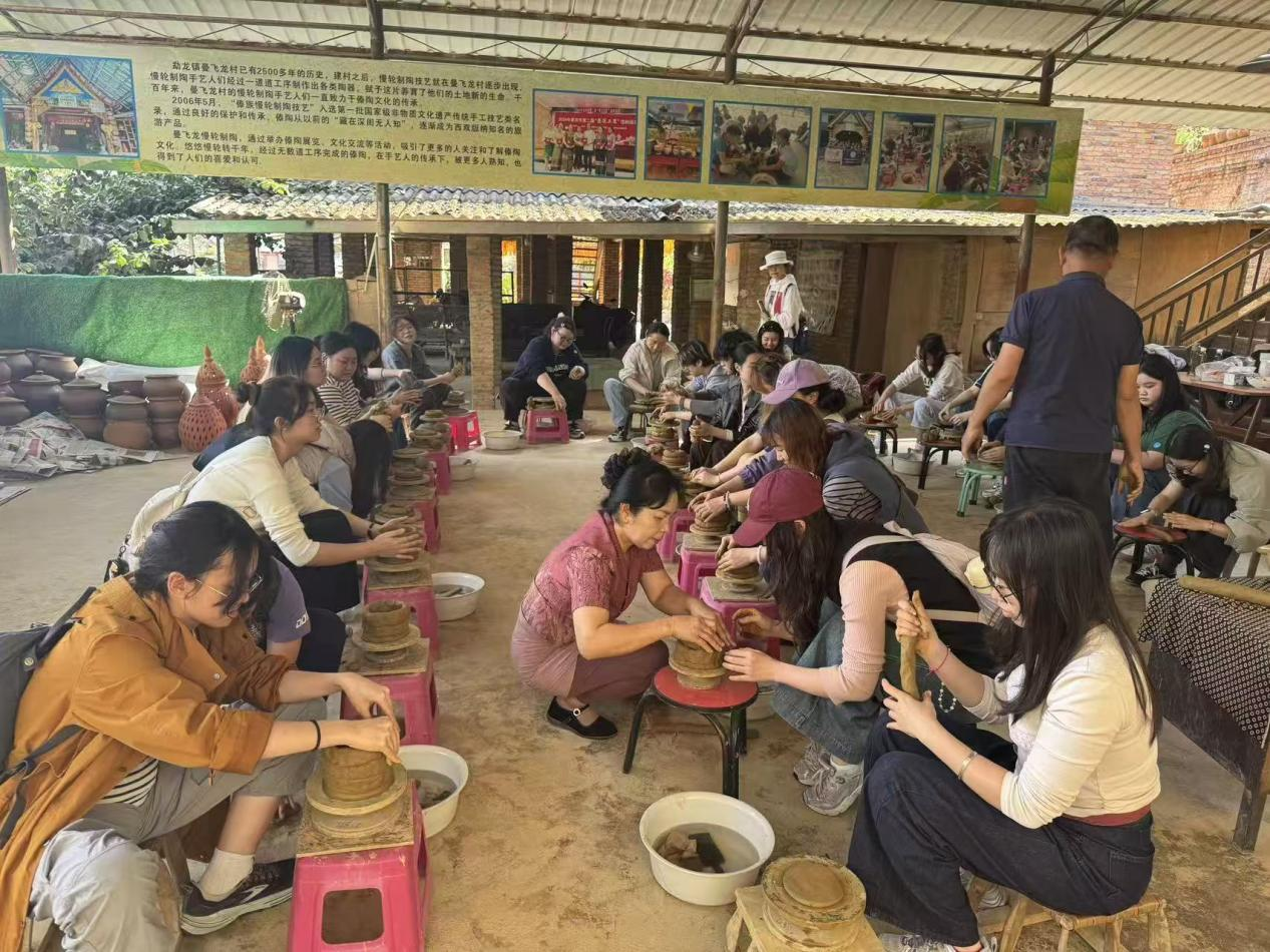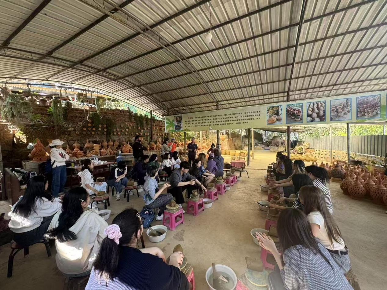 最后一站曼飞龙村慢轮制陶体验区,师生们在省级傣族传统制陶非遗传承人玉南恩的指导下,亲身体验揉泥、盘条、拉坯、塑形、刻纹的完整工序,亲手制作傣陶器皿,沉浸式领略这项国家级非物质文化遗产的独特魅力。